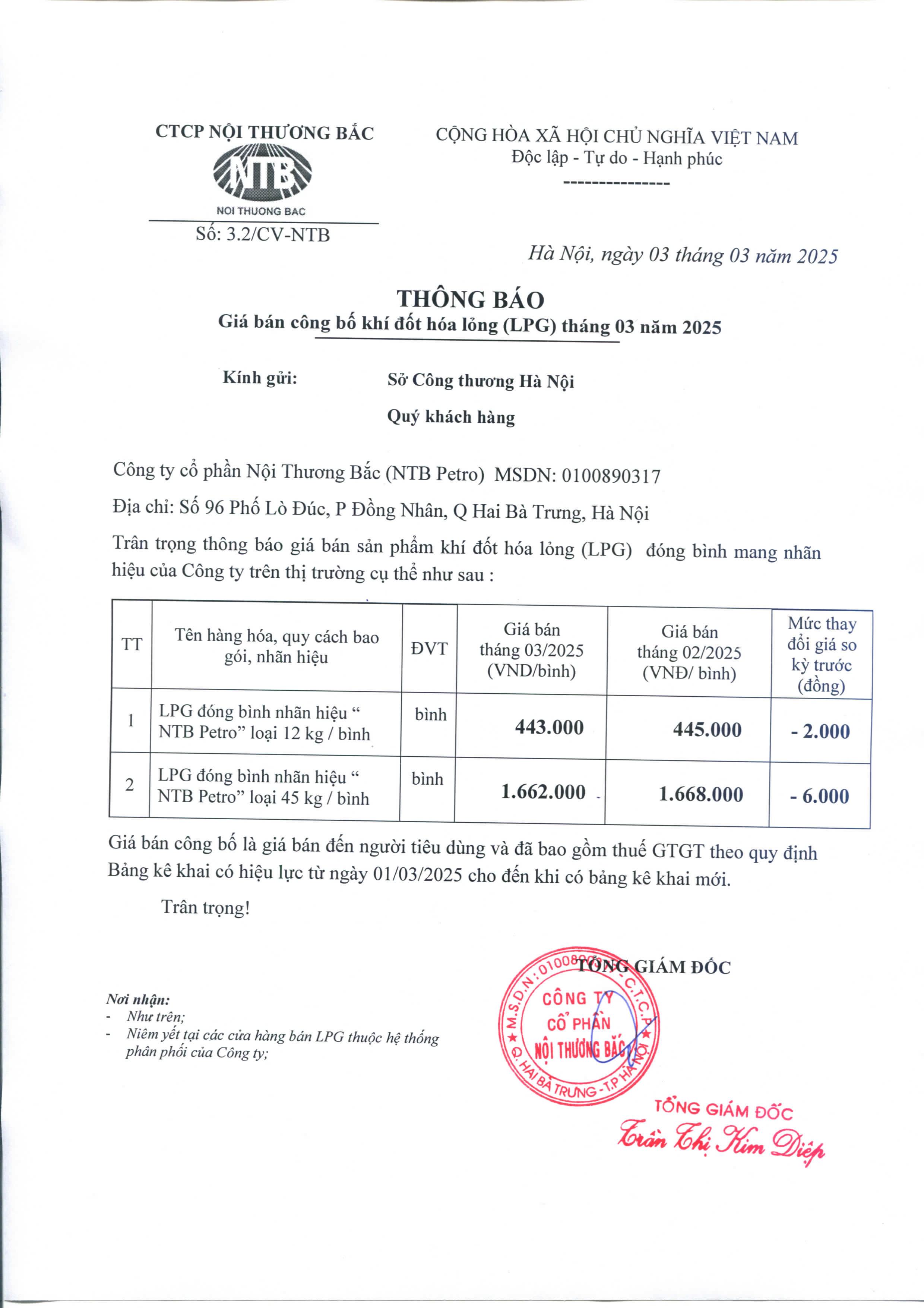 Căn cứ diễn biến giá khí dầu mỏ hoá lỏng tại thị trường nội địa và trên Thế giới trong Tháng 03.2025. Công ty Cổ phần Nội Thương Bắc xin thông báo giá bán khí dầu mỏ hoá lỏng đóng trong bình mang nhãn hiệu của Công ty trên thị trường theo như thông báo dưới đây, trân trọng cảm ơn Quý khách hàng.