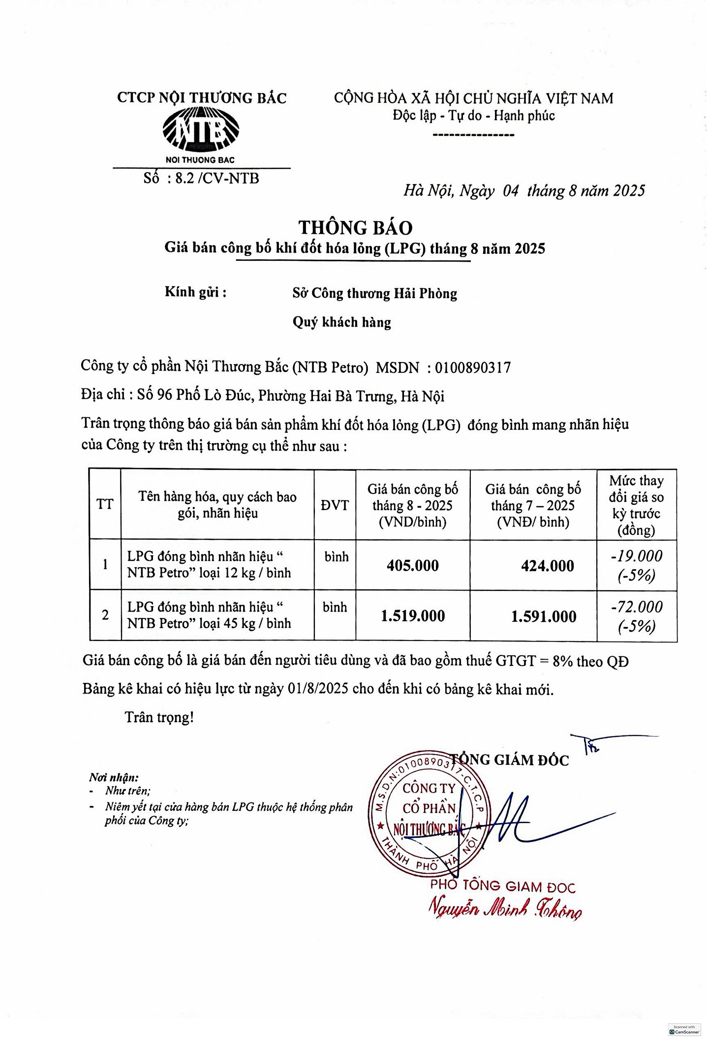 Căn cứ diễn biến giá khí dầu mỏ hoá lỏng tại thị trường nội địa và trên Thế giới trong Tháng 08.2025. Công ty Cổ phần Nội Thương Bắc xin thông báo giá bán khí dầu mỏ hoá lỏng đóng trong bình mang nhãn hiệu của Công ty trên thị trường theo như thông báo dưới đây, trân trọng cảm ơn Quý khách hàng.