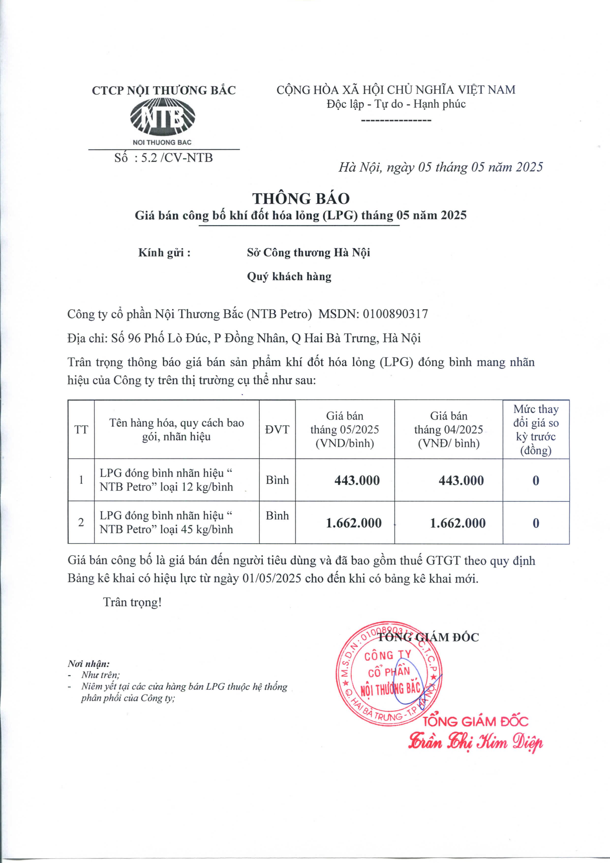 Căn cứ diễn biến giá khí dầu mỏ hoá lỏng tại thị trường nội địa và trên Thế giới trong Tháng 05.2025. Công ty Cổ phần Nội Thương Bắc xin thông báo giá bán khí dầu mỏ hoá lỏng đóng trong bình mang nhãn hiệu của Công ty trên thị trường theo như thông báo dưới đây, trân trọng cảm ơn Quý khách hàng.